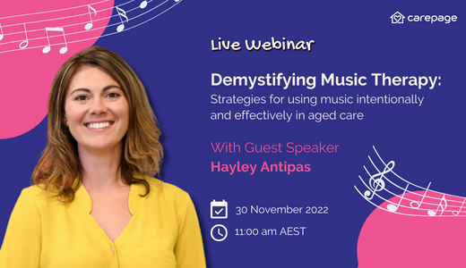 In the fourth part of CarePage’s Resident Happiness Microleaning webinar series, dual qualified Registered and Neurologic Music Therapist, Hayley Antipas, will demonstrate a variety of tangible Music Therapy strategies that carers and lifestyle teams can utilise in their facilities.